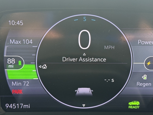 Exterior Glass, solar absorbing Headlamp control, automatic on and off Headlamps, LED IntelliBeam, auto high-beam Luggage rack, side rails, roof mounted Windshield, solar absorbing Comfort And Convenience Air conditioning, single-zone automatic climate control Antenna, roof-mounted shark fin, body-color Audio system feature, 6-speaker system Audio system feature, SD card receptacle Cruise control, electronic with set and resume speed Keyless Open, passive unlock and lock on all doors and liftgate Keyless start, push-button Lock control, liftgate, power remote lock/unlock Mirrors, outside heated power-adjustable, manual-folding with integrated turn signal indicators Remote Keyless Entry with remote start Wi-Fi Hotspot capable SiriusXM Mechanical Battery, 12-volt with rundown protection Battery, Propulsion, Lithium-ion, Rechargeable Energy Storage System Brake, electronic parking Brakes, 4-wheel antilock, 4-wheel disc DC fast charging Electric Propulsion Final drive ratio, 7.05:1 Steering, power, non-variable ratio, electric Suspension, front independent Suspension, Performance Ride and Handling Suspension, rear, semi-independent, compound crank Charge cord, Dual Level, 120-volt and 240-volt capability changeable NEMA 5-15 and NEMA 14-50 plugs with SAE J1772 vehicle connection Charging module, 11.5 kW high-voltage Electronic Precision Shift, button and trigger based drive unit interface; includes One Pedal Driving button