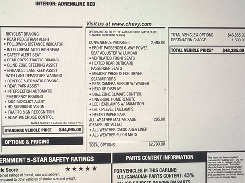 CONVENIENCE PACKAGE II FRONT PASSENGER 6-WAY POWER SEAT ADJUSTER W/ LUMBAR VENTILATED FRONT SEATS, HEATED REAR OUTBOARD PASSENGER SEATS MEMORY PRESETS FOR DRIVER SEAT/MIRRORS REAR CAMERA MIRROR W/ WASHER HEAD UP DISPLAY DUAL ZONE CLIMATE CONTROL UNIVERSAL HOME REMOTE LED HEADLAMPS W/ ANIMATION LED UPLEVEL TAIL LAMPS HEATED WIPER PARK ALL-WEATHER MAT PACKAGE, ALL-WEATHER CARGO AREA LINER